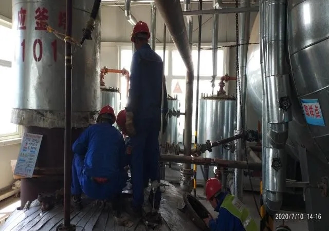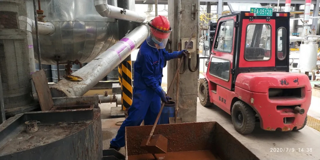 烈日炎炎,驕陽似火的七月,華御化工各個(gè)分廠停車大檢修相繼展開。此次停車大檢修,時(shí)間短促,項(xiàng)目繁多、工作量大、涉及的作業(yè)面廣。在二苯醚檢修現(xiàn)場,對4#反應(yīng)釜攪拌的更換、粗制蒸汽噴射泵和強(qiáng)制分離器內(nèi)鹽垢清理、離心機(jī)的檢修、循環(huán)水池污泥雜物清理等一系列工作有序開展。